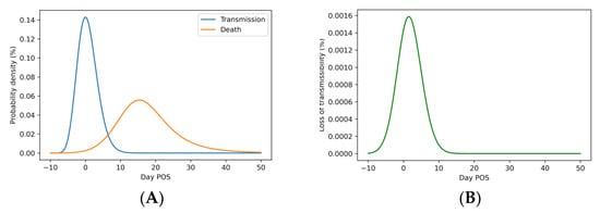 Transmission as a function of time post onset of symptoms (POS) is minimally impacted by fatal COVID-19 outcomes. (A) PDFs for COVID-19 death and transmission over time. (B) Loss of fractional transmissibility over time in fatal cases.
