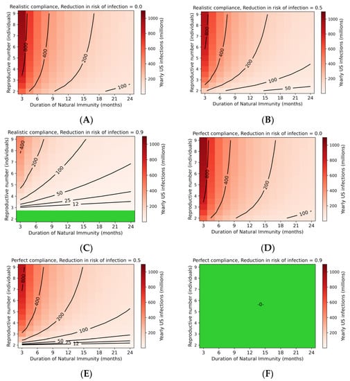 High yearly US infection counts persist under endemic conditions without vaccines that prevent transmission. Yearly US SARS-CoV-2 infections under the following conditions for vaccine compliance and VEi: Realistic vaccine compliance with (A) 0% VEi, (B) 50% VEi, (C) 90% VEi; perfect vaccine compliance with (D) 0% VEi, (E) 50% VEi, (F) 90% VEi. Green regions represent complete suppression of SARS-CoV-2 transmission.