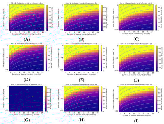 3.3. Endemic SARS-CoV-2 Death Tolls Are Highly Sensitive to Changes in IFR and Duration of Immunity