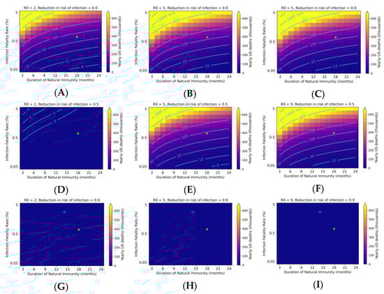 Variation in the duration of natural immunity and IFR can result in catastrophic death tolls. The green point represents parameter values corresponding to best-estimates of immunity and IFR for ancestral SARS-CoV-2. Yearly US COVID-19 deaths under the following transmissibility (R0) and VEi conditions: (A–C) 0% VEi and R0 of 2, 5, and 9; (D–F) 50% VEi and R0 of 2, 5, and 9. (G–I) 90% VEi and R0 of 2, 5, and 9. Vaccine compliance is 70% among under-65 year olds and 90% among over-65 year olds, and VEm is 90% in all panels.