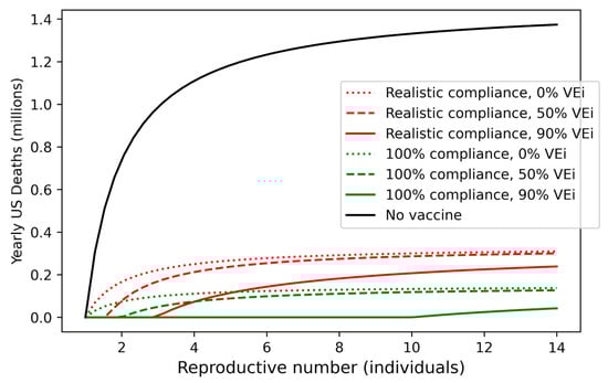 Using the United States as an example, we note that the COVID-19 fatalities associated with the ancestral variant’s IFR (0.68%), vaccine parameters, and estimated duration of sterilizing immunity for COVID-19 (18 months) can be estimated at around 250,000 per year. The death toll due to COVID-19 vastly exceeds the mortality burden of the other leading infectious diseases in the US [95]. Accepting a new leading cause of death in the United States for the indefinite future will have profound impacts on life expectancy (as estimated by others based on 2020 data [96,97]), and public-health planning should treat these impacts as the best-case scenario, instead of optimistically planning for them to reduce over time.