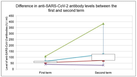 The percentage of people infected with the SARS-CoV-2 virus in the general population of Lower Silesia as of 22 February 2021 was 3.71% [18]; however, this result applies only to positive PCR swabs. In our study group, this percentage was 14.37% and concerned the presence of antibodies. However, it should be noted that in our study, patients did not report SARS-CoV-2 infection or flu-like symptoms during the observed period. At the same time, in the Republic of Poland, swabs for SARS-CoV-2 infection were performed only from people with symptoms of COVID-19. In this case, it can be assumed with high probability that the percentage of 3.7% in the general population of Lower Silesia was underestimated and did not include people with mild symptoms and asymptomatic infections. At the same time, due to the lack of research and determination of the prevalence of anti-SARS-CoV-2 antibodies in the population of Lower Silesia during this period, it is technically not possible to compare our results, which is why we compare our results with cities with a population of similar size, at a similar time. There is an interesting observation of higher antibody levels at the second test term compared to the first term test in a population that was previously negative. This can be explained by the difference in the types of virus that dominated the successive waves. The second wave was related to the alpha variant, which spread more efficiently, and those infected with it were at a higher risk of severe disease and death than the original variant of SARS-CoV-2. At the same time, more severe courses of SARS-CoV-2 infection were associated with higher levels of antibodies [19,20]. Of course, there is the possibility that the higher level of anti-SARS-CoV-2 antibodies could also have been due to the time interval of blood sampling. A certain group of patients may have been asymptomatically infected at the first visit and not yet producing antibodies, which gave the immune system more time to produce higher levels of Ab. There is also the possibility of multiple exposures to the virus, which would naturally also result in higher levels of anti-SARS-CoV-2.