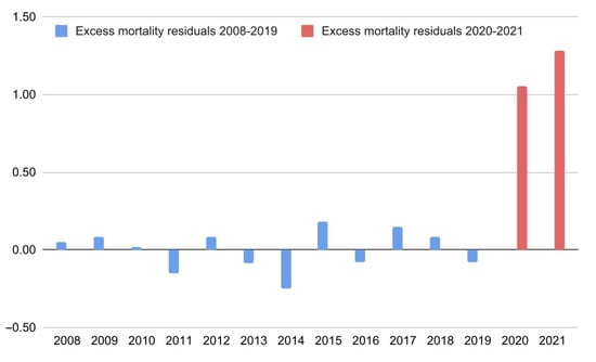 Excess mortality residuals (differences between the model’s predictions and observed data) in Europe from 2008 to 2021. The data shown concern the latest linear trend identified by the joinpoint regression (2008–2019).