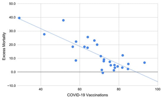 Excess mortality in European countries during 2021 as a linear function of COVID-19 vaccines (1 + doses). Each additional percentage point in vaccinations corresponds to a decrease in mortality of about 0.65 (Radj2 = 0.65).