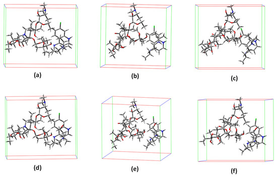 Representation of optimized co-crystal structures in this study. (a) CQ/AZ; (b) CQ/CL; (c) CQ/ER; (d) HQ/AZ; (e) HQ/CL; and (f) HQ/ER.