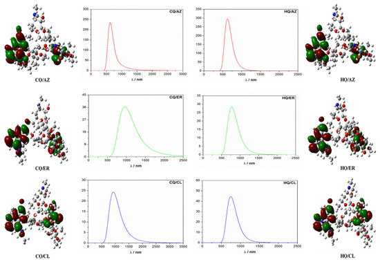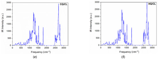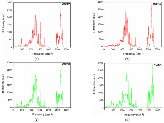 The typical calculated infrared (IR) spectrum is shown in Figure 2a–f. According to these results, we observed only positive modes, suggesting that the structures proposed in this study are well optimized and therefore represent a minimum energy. Further, the IR-active modes confirm that co-crystals were obtained with a monoclinic-like structure. These results are consistent with experimental observations for both (hydroxy)chloroquine and macrolide antibiotics [1,12,42,43]. As can be seen in Figure 3, the computed UV-vis absorption spectrum of these co-crystals revealed only one well-defined peak. As such, the more intense UV band located in the range of 617 nm to 771 nm for the HQ-based co-crystals (AZ to ER) is due to a predominant HOMO-to-LUMO+2 transition. In comparison, for the CQ-based co-crystals (AZ to ER) this UV band was located from 624 nm to 955 nm (which is due to a predominant HOMO-to-LUMO+3 transition for CQ/AZ, and both CQ/CL and CQ/ER was best assigned to HOMO-to-LUMO+2 transition).