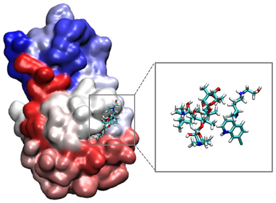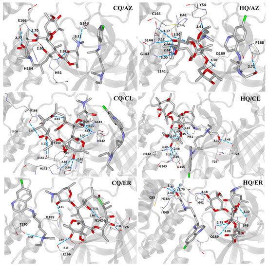 As shown in Table 3, all of the single and co-crystals studied interacted very well with the Mpro active site, with interaction energy values in the range of −141.7 to −280.7 kcal mol−1. We also observed that the co-crystal formed by HQ and AZ had the highest stabilizing interaction energy (−280.7 kcal mol−1), followed by the co-crystals HQ/ER (−275.7 kcal mol−1) and CQ/AZ (−275.3 kcal mol−1). The conformation of HQ/AZ in the Mpro active cavity is shown in Figure 4. Note that the single crystals of CQ and HQ had interaction energies of approximately −141.7 and −162.6 kcal mol−1, respectively. However, when combined with AZ, these single crystals gained stability and had lower interaction energies. In fact, the single crystal of AZ was much more stable than those of CQ and HQ when docked in the active site, and their combination with AZ led to increased affinity for the viral enzyme. Regarding the co-crystals formed by the combination with AZ, we observed the following energy differences: HQ to HQ/AZ (118.1 kcal mol−1) and CQ to CQ/AZ (133.6 kcal mol−1). Based on our computations, CQ/AZ was the co-crystal that showed the more significant energy difference, followed by HQ/AZ, suggesting the suitability of combining AZ with CQ and HQ, thus boosting their therapeutic effects (Table S1).