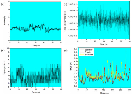 (a) RMSD, (b) Total Energy, (c) Hydrogen Bond, and (d) RMSF graphs of a 60-ns simulation of the HQ/ER-Mpro complex.