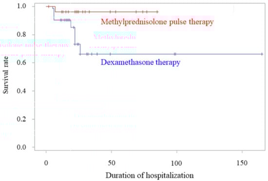 There were eight hospital deaths (one in the methylprednisolone pulse therapy group and seven in the dexamethasone therapy group). The causes of death were intraperitoneal bleeding (one patient in the methylprednisolone pulse therapy group), respiratory failure (five patients in the dexamethasone therapy group), and acute myocardial infarction and gastrointestinal bleeding (one patient each in the dexamethasone therapy group). All of the deaths occurred within 1 month of hospitalization. In addition, in the methylprednisolone pulse therapy group, 1/15 patients (6.7%) died with the use of remdesivir and 0/3 patients (0.0%) died with favipiravir. On the other hand, in the dexamethasone therapy group, 3/23 patients (13.0%) died with the use of remdesivir, and 3/7 patients (42.9%) died with favipiravir.