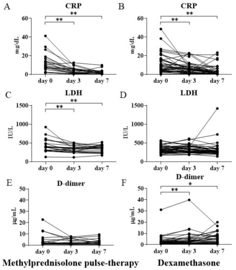 Serum CRP, LDH, and plasma D-dimer levels before and after initiating methylprednisolone pulse therapy or dexamethasone therapy. The changes in CRP (A,B), LDH (C,D), and D-dimer (E,F) levels before treatment and on days 3 and 7 after treatment initiation in the methylprednisolone pulse therapy and dexamethasone therapy groups. Values are presented as mean ± SEM. * p < 0.05, ** p < 0.01. CRP = C-reactive protein; LDH = lactate dehydrogenase; SEM = standard error of the mean.