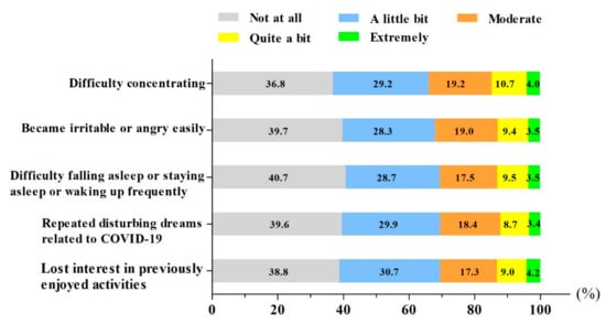 The public suffered varying degrees of psychological stress during the public health emergency due to COVID-19. In February and March of 2020, all healthy Chinese residents throughout the nation were required to stay at home and maintain strict social distancing [23]. This strict lockdown policy resulted in cognitive distress, negative emotions, and reduced sleep quality in the general population [24]. The quarantine has proved to be associated with psychological distress and a high prevalence of mental health symptoms [25]. The present nationwide survey enrolled 10,545 participants from 25 April to 11 May 2020, in the immediate aftermath of the strict lockdown. Our main findings were that levels of emotional distress remained high and were associated with a number of demographic and lifestyle factors.