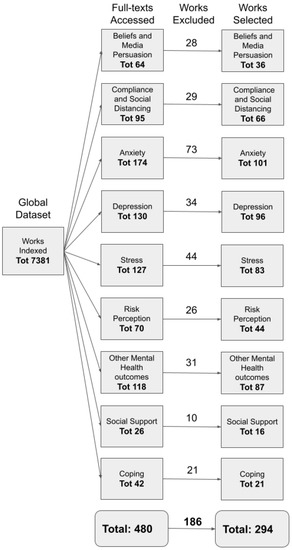 As a first step, we asked academic information specialists to search for COVID-19 scientific papers that fulfilled our inclusion criteria. These were: written in English language; published between December, 2019 and June, 2020; being an empirical study, project report or review; published in a scholarly peer-reviewed journal and/or conference proceedings; those related to psychological dimensions and mental health (i.e., psychological disorders, risk perception, beliefs, coping, compliance, social support).