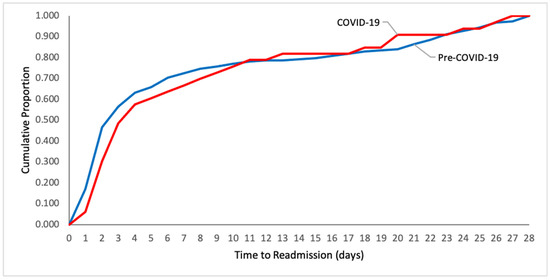 Figure 3 shows the cumulative proportion of readmissions by time to hospitalization. There was no difference in the cumulative distribution function, with a Kolmogorov-Smirnov test D(215) = 0.997, (p = 0.27) indicating no difference between time to readmission between the cohorts.