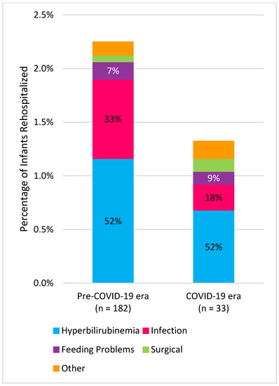 Readmitted infants and reason for readmission during first 28 days after discharge. Footnote—Infection includes confirmed or suspected fever and hypothermia. Feeding problems include dehydration. The distribution of readmission reason in the pre-COVID-19 era included 52% hyperbilirubinemia, 33% infection, 7% feeding problems, 3% surgical, and 6% other. The distribution of readmission reason in the COVID-19 era included 52% hyperbilirubinemia, 18% infection, 9% feeding problems, 9% surgical, and 12% other.