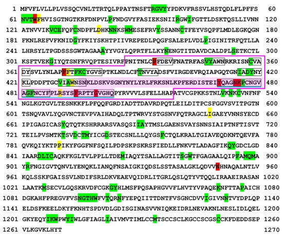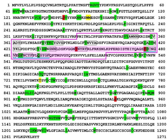 Self/nonself mapping of the SARS-CoV-2 spike protein of the Delta variant. The first amino acids of nonself SCSs are indicated by green (present in RefSeq) or red (new in this variant) shading. The first amino acids of new self SCSs in this variant (not present in RefSeq) are indicated by yellow shading. Other SCSs with no such indications are self SCSs. The receptor binding domain (RBD) [60] is boxed in pink lines. The receptor binding motif (RBM) [61,68] is shaded in pink. The nonself SCSs in the RBM are boxed in black lines. A potentially important nonself SCS region for vaccine development in the RBD is underlined in blue. For self/nonself mapping of RefSeq, see Otaki et al., (2021) [59].