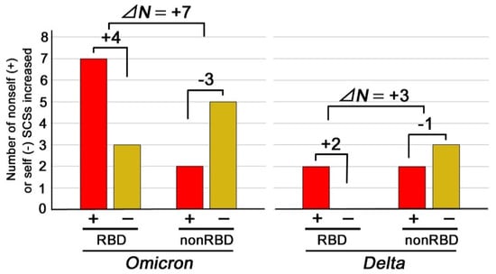 The number of nonself (+) and self (−) SCSs increased in the RBD or non-RBD regions in the Omicron and Delta variants. Newly emerged nonself SCSs (self-to-nonself status changes) are shown in red bars, whereas newly emerged self SCSs (nonself-to-self status changes) are shown in yellow bars. Note the difference between RBD and non-RBD and the difference between the Omicron and Delta variants. ΔN in this figure indicates the differences in the net changes between the RBD and non-RBD regions of the Omicron or Delta variant.