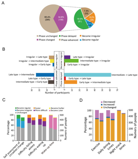 Changes in the circadian rhythm characteristics. (A): The proportions of participants who reported changes in their circadian rhythms. (B): The bar chart shows the number of people who reported each of the 4 phase-change types (12 subtypes). (C): The percentages and numbers of people who reported each of the four types of circadian rhythm changes. (D): The percentages and numbers of people who reported changes in exercise, daily dining times, and night snack times. For each stacked bar chart (C,D), in two parallel bars, the one on the left represents proportion and the one on the right represents the number of people.