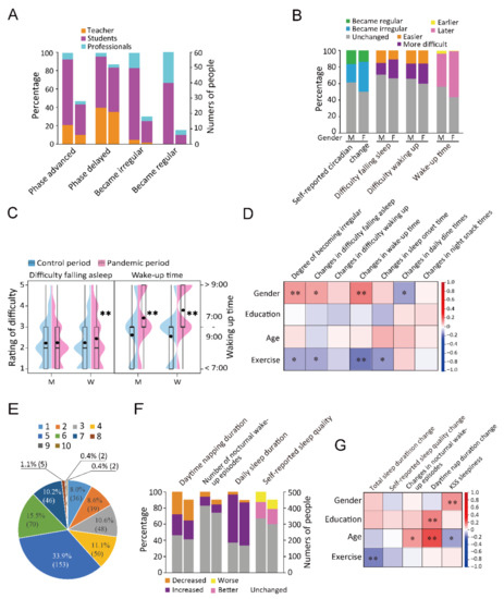 Changes in sleep-related parameters. (A): The percentages and numbers of participants of each profession (teachers, students, and professionals) in phase changes of the four variables. (B): The percentages of people of different genders in four circadian rhythm variables. M presents male and F presents female. (C): Violin plot and box plot visualizing the between-gender comparison of difficulty falling asleep and wake-up time. M presents male and F presents female. ** p < 0.01. (D): Correlations between demographic factors and circadian rhythms. * p < 0.05, ** p < 0.01. (E): Distribution of 10 scores of KSS-rated sleepiness. (F): An accumulative bar diagram showing the percentages and numbers of people who reported changes in the four sleep variables. (G): Correlations between demographic factors and sleep. * p < 0.05, **p < 0.01. For stacked bar charts (A,F), in two parallel bars, the one on the left represents proportion and the one on the right represents number of people.