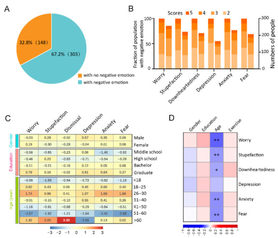 Analysis of the negative emotion. (A): The percentages of participants who reported and did not report negative emotions. Participants “with negative emotion” is defined as those who reported at least one of the six negative emotions. (B): An accumulative bar diagram showing the fraction (left) and numbers (right) of participants with different grades of assessed negative emotion types. These negative emotions were assessed on a 1–5 scale indicating the different degrees of negative emotions as follows: 1, 2, 3, 4, and 5 indicated no, slight, mild, moderate, and severe negative emotions, respectively. (C): The self-assessed negative emotions were classified according to gender, age, and education. We calculated the average scores of each negative emotion. The numerals in the heat map are Z-score values after normalization by column. * p < 0.05, ** p < 0.01. (D): Correlations between negative emotions and gender, education, age, and exercise. * p < 0.05, ** p < 0.01.