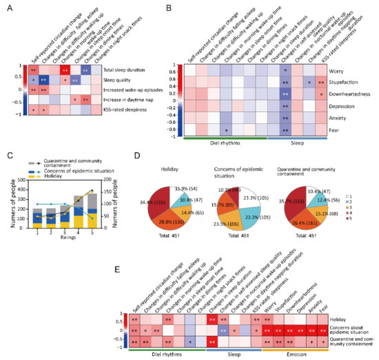 Correlative analysis among the changes in circadian rhythms, sleep, and mood. (A): Spearman correlation between circadian rhythms and sleep. * p < 0.05, ** p < 0.01. (B): Spearman correlation coefficient analysis of circadian variables, sleep, and mood. * p < 0.05, ** p < 0.01. (C): Subjective self-evaluation of the effects of the three factors: holiday, concerns about the epidemic situation, and quarantine or community containment on circadian rhythms and sleep. Here, 1 indicates no effects while 2–5 indicate increased effects. Columns in the different colors represent the numbers and ratios of participants who rated the corresponding grades as indicated. Line graphs in the different colors represent the numbers of participants who rated the corresponding grades as indicated. (D): Pie charts showing the proportions of participants who reported disturbed circadian rhythms and sleep due to the following three factors: holiday, concerns about the pandemic situation, and quarantine or community containment. The ratings are the same as those in (C). (E): Spearman correlation coefficient analysis among circadian rhythms, sleep, and negative emotion. * p < 0.05, ** p < 0.01.
