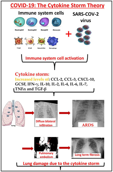 The uncontrolled production of cytokines, i.e., the cytokine storm, has the strongest link between morbidity and mortality in COVID-19 patients [35,36,37,38]. The cytokine storm is usually a warning sign of COVID-19 escalation and severity, characterized by rapid releases of inflammatory cytokines and chemokines [38,39,40,41,42,43,44].