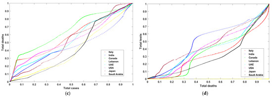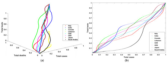 The outcome of this process is a set of variables strongly correlated for each selected country. The starting point for these data is the first week of April 2020 until the end of July 2021. There are 487 records with three variables: the total number of cases (TC), the total number of PCR tests (TT), and the total number of deaths (TD). These variables are normalized by dividing the variable by the maximum-recorded value. We obtained a list of records with values that range between 0 and 1. To measure the correlation between these variables, four different graphs are plotted. Figure 2a shows the curves that describe the progress of total tests vs. total cases vs. total deaths in three dimensions. Figure 2b–d show total tests vs. total cases, total tests vs. total deaths, and total cases vs. total deaths in two dimensions. One can notice in Figure 2a–d that Lebanon (yellow color) has incomplete curves, and that some countries recorded data describing the outbreak and the progress of COVID during that period. Moreover, one can notice from the graphs that there was extensive use of PCR tests and a low number of total cases (except in Saudi Arabia, with low total tests). Later, there was more control of the pandemic such that these PCR tests became proportional to the number of COVID-19 cases. Finally, the number of deaths is also linearly proportional to the number of cases and tests.