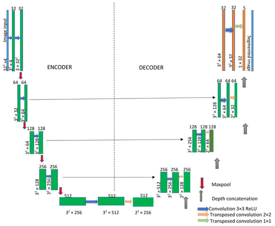The UNet architecture consists of a decoder and encoder. The encoder decreases the spatial dimensions in every layer while the decoder increases the spatial dimensions. The encoder is the first half of the architecture (Figure 4). Normally, it is a pretrained classification network such as ResNet [37], where you apply convolution blocks, followed by a maximum pool layer as a downscaling process to encode the input image into feature representations at multiple, different levels.