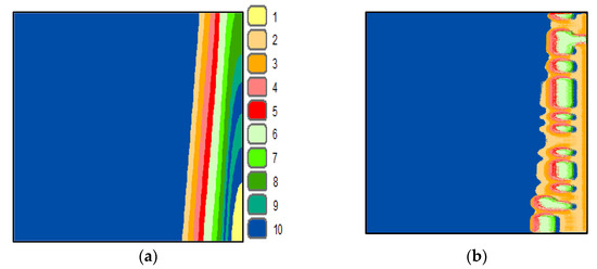 Furthermore, the segmented image by SOMs is analyzed statistically. The analysis showed that the percentage of pixels is as follows: 0.86, 2.26, 2.34, 2.38, 2.32, 3.27, 2.12, 2.52, 2.25, and 79.68% for clusters 1 to 10, respectively. This means that class 10 (dark blue) is the highest number of pixels, and class 1 (light yellow) is the lowest. The images (Figure 3a–g) are classified using UNet based on the previous settings. UNet progress during the classification of the images is shown in Figure 6a–g. The behavior of UNet is based on computing mini-batch accuracy that does not reflect the accuracy of the overall classified data. According to [43], the best mini-batch size should not be greater than 32. The overall classified image accuracy is determined using the confusion matrix, and the target data that was obtained previously using SOMs.