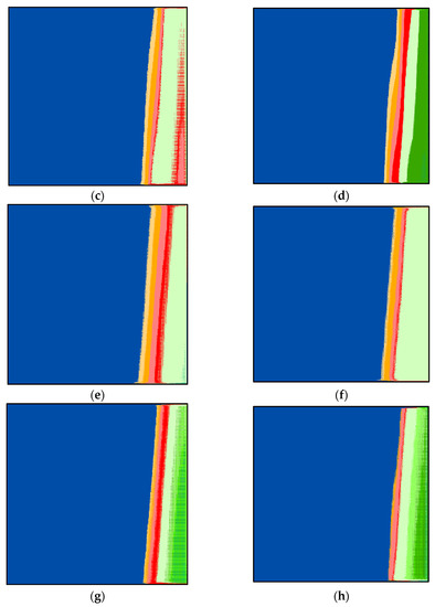 The important UNet parameters are set to provide the optimal result and to avoid falling in the local optima. The size of the provided input to UNet is 512 × 512 × 3 pixels. The number of mini-batches is 16 (mini-batch size), the number of patches per image is 128, the number of epochs is 32, the input tile size is 128 × 128 × 3, the initial learning rate is 0.005, and the number of classes is 10. Based on Equation (3), the number of iterations is equal to 256. The classifications are displayed in Figure 5b–h. By investigating these figures and by comparing them to the reference image (Figure 5a) visually, one can notice that class 1 (in light yellow) is missing from all figures. This explains why the UAE is one step ahead of other countries. The investigation revealed that the UAE had the highest number of PCRs per thousand of its population compared to other countries around the world [42].