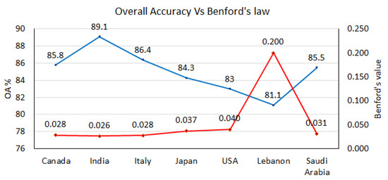The calculated Benford’s law values for all countries (except the UAE) are displayed with OAs in Figure 7. We can easily notice that Benford’s curve corresponds to OA’s curve such that the higher OA, the lower the Benford’s law value. This provides a high degree of confidence in the obtained results by the CCNN model.