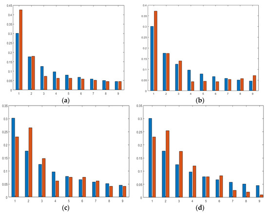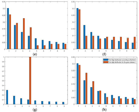 To be more confident in the obtained results, Benford’s law, also known as the Newcomb–Benford law or the first-digit law [41], can be used to determine the degree of confidence. The law is an observation that in many sets of numerical data, the leading digit is likely to be small. A group of statistical surveys can follow Benford’s law if the leading digit D occurs with probability as of Equation (6).