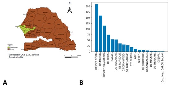 Samples sites collection. (A) The sites colored in yellow represent the different collection areas. (B) represents the distribution of the number of samples with on the y axis we have the number of samples and the different collection sites on the x axis.