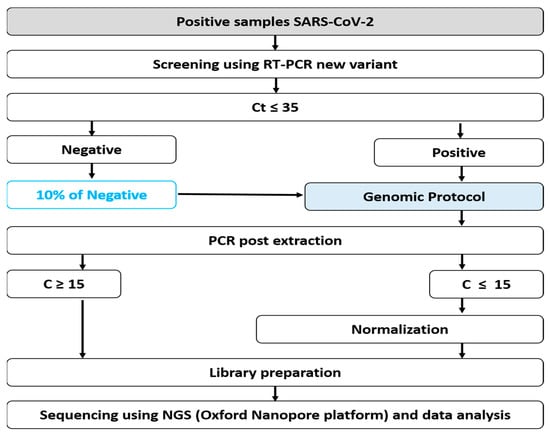 To extract the RNA, the oropharyngeal and/or nasopharyngeal samples were first inactivated in a water bath at 90 °C for 30 min. The samples were then aliquoted in 1.5 mL vials, before RNA was extracted using the Kingfisher platform according to the manufacturer’s guidelines and eluted in 50 μL (www.thermofisher.com, accessed on 22 January 2022, SARS-CoV-2 support and solutions KingFisher instruments and MagMAX isolation kit).