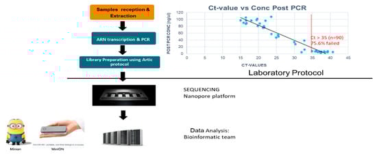 Library prep was done following the ARTIC protocol (Version3) (Josh Q). Twenty-four barcoded libraries were sequenced on one flow cell using MinION (Nanopore technology) with expected coverage of more than 65×. We tested the correlation between post-PCR concentration and Ct value and our results showed that the lower, the Ct value the higher the post-PCR concentration (Figure 3).