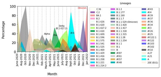 For further investigation, we explored the evolution of the lineages over time. We calculated the percentage of each lineage over each month from June 2020 to January 2022, the percentage of which cumulates to 100% to visualize using again the matplotlib module of python version 3.9.0 (Figure 4).
