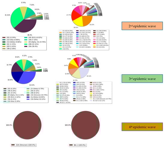 Distribution of the different epidemic waves observed in Senegal according to the clade and lineage detected.