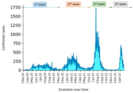 Evolution over time of confirmed cases per day over time during SARS-CoV-2 pandemic in Senegal.