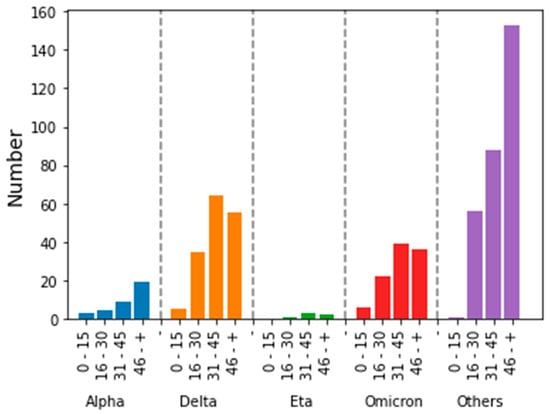 The second wave of the global epidemic was marked by the emergence of the Delta variant. Indeed, the Delta variant represented 97.62% of the global sequences shared during week 32 (3–9 August). This period coincided with the mass detection of the B1.617.2 variant in Senegal. The Alpha variant was found mainly in people over 46 years old (60.8%), as was the Eta variant (45%). The Delta variant affected mainly (60%) individuals between 31 and 45 years old. For the non-VOCs, most cases (53%) were over 46 years old.