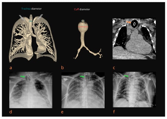 Radiological diagnosis of tracheomegaly (TM). A 3D view (CT scan) of the tracheobronchial tree with determination of the diameter of the trachea (T diameter) in the clavicular area (a). A 3D view (CT scan) of the trachea with TM and determination of the diameter of the trachea in the cuff area (C diameter) (b). Native CT scan of the thorax thirteen days after intubation. A coronal plane showing TM in the cuff area (orange arrow) with a C/T diameter ratio of 2.31 (c). Chest X-ray shows TM (green arrow) in the area of the tracheostomy tube cuff nine days after intubation with a C/T diameter ratio of 2.12 (d). Chest X-ray shows TM (green arrow) in the cuff area of the endotracheal tube 8 days after intubation with a C/T diameter ratio of 1.95 (e). TM (green arrow) visible on a chest X-ray twelve days after intubation and three days after a tracheotomy with a C/T diameter ratio of 2.02 (f).