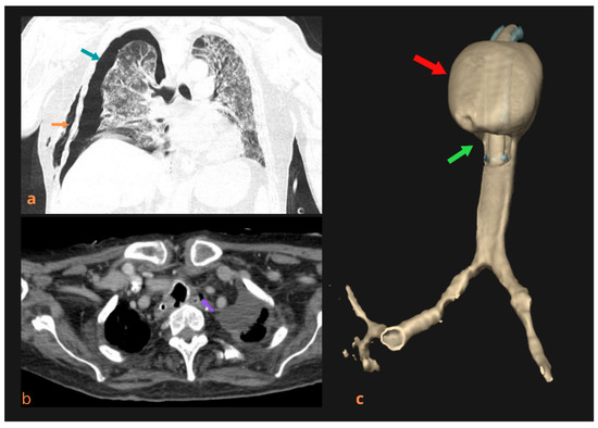 Life-threatening complications caused by damage to the tracheal wall due to TM in the cuff area of the endotracheal tube or tracheostomy tube. Thoracic CT scan showing a right-sided pneumothorax (green arrow) and subcutaneous emphysema (orange arrow) (a). CT scan of a patient with a clinically (larger amount of air appeared in the nasogastric tube, along with abdominal distension and hyper-resonance on abdominal percussion, along with the appearance of food on the tracheostomy tube) and a bronchoscopically identified tracheoesophageal fistula. Axial plane showing pneumomediastinum (purple arrow) (b). A 3D view of the trachea with TM (red arrow) and interruption of the continuity of the membranous part of the posterior trachea wall in the cuff area (green arrow) (c).