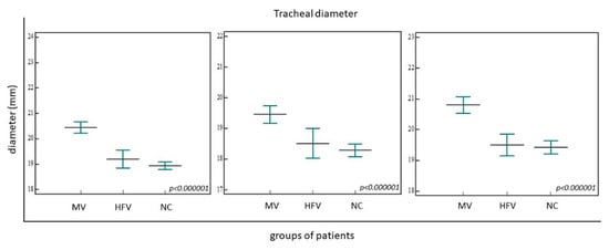 The trachea diameter in the first X-ray image in the group of patients treated with HFV was 19.20 ± 2.03 mm overall (19.64 ± 1.63 mm in female patients and 20.04 ± 1.70 mm in male patients), while in the group of patients treated with NC, it was 18.93 ± 1.31 mm overall (18.29 ± 1.66 mm in female patients and 19.58 ± 1.72 mm in male patients). Furthermore, the initial trachea diameter in the first X-ray image in the group of patients treated with MV was 20.44 ± 2.21 mm overall (19.37 ± 1.59 mm in female patients and 20.80 ± 2.28 mm in male patients). The tracheal diameter was analyzed between all included groups using the Kruskal–Wallis test with pairwise comparisons according to Conover; statistical significance was observed between patients treated with MV in regard to HFV and NC (DF = 2, p < 0.000001). Additionally, the same significance was obtained for both female and male patients (DF = 2, p < 0.000001) (Figure 3).