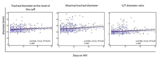 Trachea diameter at the level of the cuff, maximal trachea diameter, and C/T diameter ratio with respect to days on MV in patients overall showed statistical significance in the group of patients treated with MV (n = 383). Each regression line is presented alongside 95% confidence lines, while individual plots represent each patient included in the study. Abbreviations: MV—mechanical ventilation.