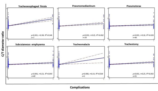 Statistical significance is presented between each complication and C/T diameter ratio as follows: tracheoesophageal fistula (p < 0.001, r = 0.38, R2 = 0.146, n = 7), pneumomediastinum (p < 0.001, r = 0.25, R2 = 0.062, n = 20), pneumothorax (p = 0.001, r = 0.16, R2 = 0.026, n = 46), subcutaneous emphysema (p < 0.001, r = 0.21, R2 = 0.045, n = 40), tracheomalacia (p = 0.008, r = 0.14, R2 = 0.018, n = 1), and tracheotomy (p < 0.001, r = 0.25, R2 = 0.061, n = 31). Each regression line is presented alongside 95% confidence lines, while individual plots represent each patient included in the study.