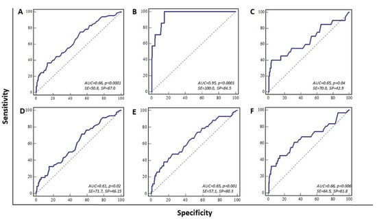 Receiver operating characteristic (ROC) curve analysis of complication overall (A), tracheoesophageal fistula (B), pneumomediastinum (C), pneumothorax (D), tracheomalacia (E), and subcutaneous emphysema (F) to present the potential prognostic value of the C/T diameter ratio. AUC—area under the curve, SE—sensitivity (%), SP—specificity (%).