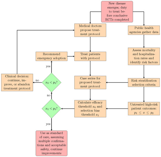 As a result, we can assert the existence of treatment efficacy using two distinct standards of evidence. If we can establish , then the preponderance of evidence is in favor of the existence of treatment efficacy, and this can justify its provisional adoption on an emergency basis, in order to gather more evidence. If we can establish that , then the evidence becomes clear and convincing, and if these results are replicated by multiple treatment centers, then it becomes ethically questionable to deny patients access to the treatment protocol, for the purpose of conducting an RCT, or simply due to therapeutic nihilism by public health authorities. In Figure 1, we show how the proposed statistical methodology can be integrated into an epidemic or pandemic response that leverages and deploys the direct experience of frontline medical doctors, resulting from their efforts to treat their patients. We stress again that this approach is appropriate only for treatment protocols using repurposed medications with known acceptable safety. When new medications, as opposed to repurposed drugs, are introduced into a pre-existing treatment protocol, then they should be rigorously tested both for safety and efficacy with prospective RCTs.