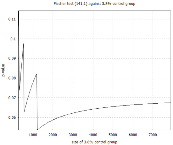 We now make the following comments about the above hypothesis testing technique. First, we note that the p-value , corresponding to a comparison of a case series of a treatment group against the probability x of an adverse outcome without treatment, as given by Equation (2), can be also obtained by running an exact Fisher test with an artificial control group of M patients with b adverse outcomes, with , in the limit where the size of this artificial control group goes to infinity. In Appendix A, we give a mathematical proof of this claim and also explain the mathematically precise formulation of the statement. This convergence property is in fact, a consequence of a known relationship [67,68,69] between the hypergeometric distribution, used in the calculation of the exact Fisher test p-value, and the binomial distribution used in the calculation of .