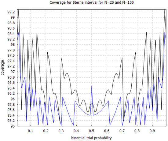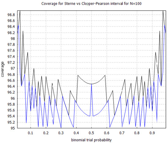 Comparison of the coverage probability for the Clopper–Pearson interval [75] versus the Sterne interval [71] with sample size . The black curve shows the coverage probability for the Clopper–Pearson interval, and the blue curve, which is situated below the black curve, shows the coverage probability for the Sterne interval. The coverage probabilities were calculated using increments on the horizontal axis.