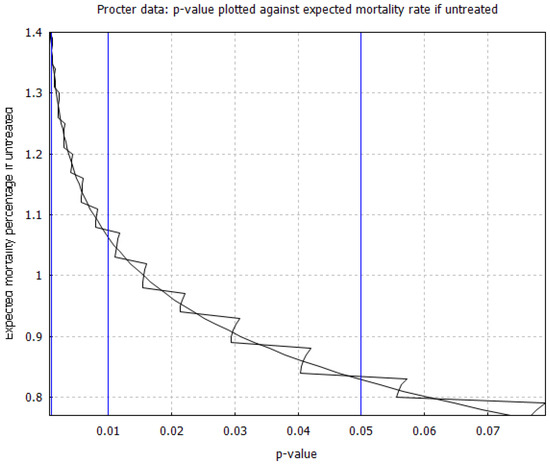 Relationship between p-value and expected mortality rate for high-risk patients without early treatment, based on the case series data from Procter’s dataset of 869 high-risk patients [12]. The zigzag curve follows given by Equation (2), whereas the smooth curve approximates the right tail terms in the p-value sum by replacing them with the left-tail terms on the horizontal axis.