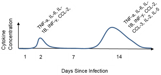 Cytokine concentration over time in COVID-19 patients. The graph shows an increase in cytokine concentration in serum post-infection. There is an increased modulation of the immune system via additional cytokines.