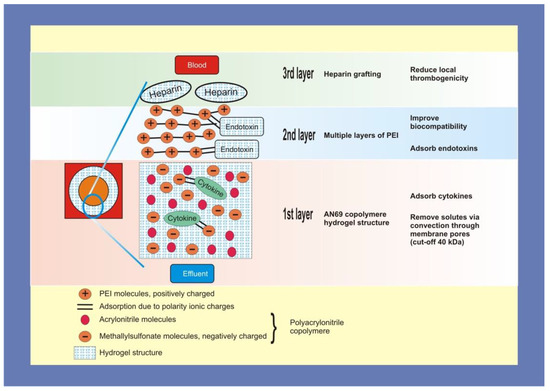 oXiris is a filter device that can remove cytokines and other inflammatory mediators through its membrane properties. Of the various extracorporeal modalities that exist, the oXiris membrane is unique in that it removes both cytokines and endotoxins through ionic interactions. oXiris is made of an acrylonitrile and sodium methallyl sulfonate copolymer (AN69 copolymer), covered with polyethyleneimine and heparin grafted at a mean concentration of 4500 + 1500 IU/m2 with a standard deviation of 1500 IU/m2. Each layer of oXiris plays a certain role in its filtering capabilities. In the innermost layer, the AN69 copolymer is negatively charged due to the sulfonate, which aids in attracting the positively charged cytokines to separate them from the blood. The second layer is positively charged via polyethyleneimine, which aids in attracting the negatively charged endotoxins. The third layer of heparin addresses the hypercoagulability of the patient and aids in clot prevention (Table 2). oXiris’s mechanism of action is depicted in Figure 2.